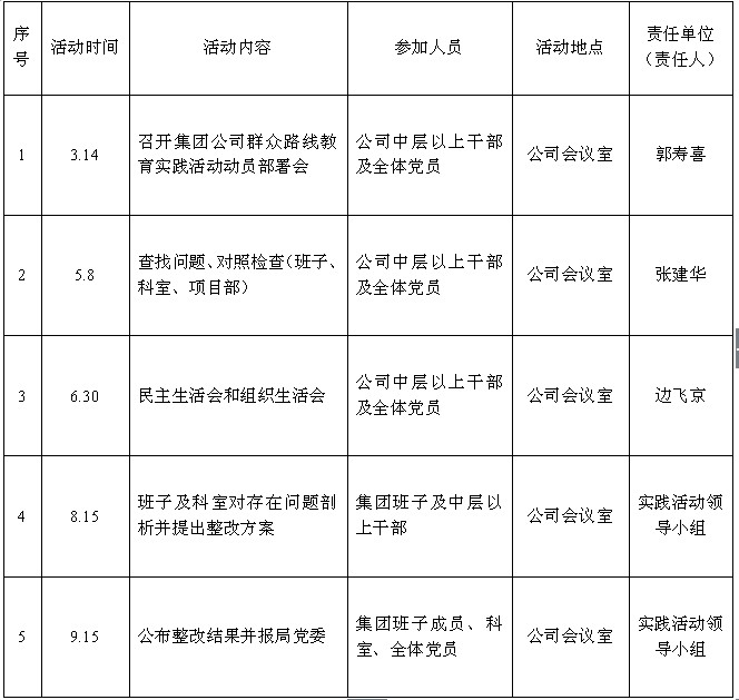 根据公司党总支党的群众路线教育实践活动学习教育听取意见环节工作情况,公司拟定了群众路线教育实践活动学习教育听取意见环节的大体工作安排,详见下表。